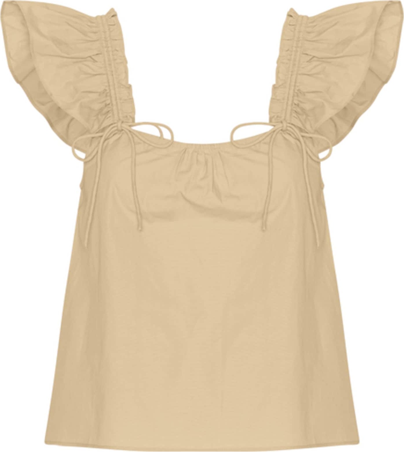 Styl halenky: Halenkové tričko; Design: Prošitý spodní lem, Rovný lem, Na uzel/zavázání, Zadní výstřih; Materiál: Bavlna; Vzor: Jednobarevný; Košilový límec: Bez límečku; Udržitelnost materiálu: Bavlna (z ekologického zemědělství); Detaily: Volánky, Nařásněné; Extra: Švy tón v tónu, Měkký povrch; Střih: Normální střih; Délka rukávu: Bez rukávů; Délka: Normální délka
