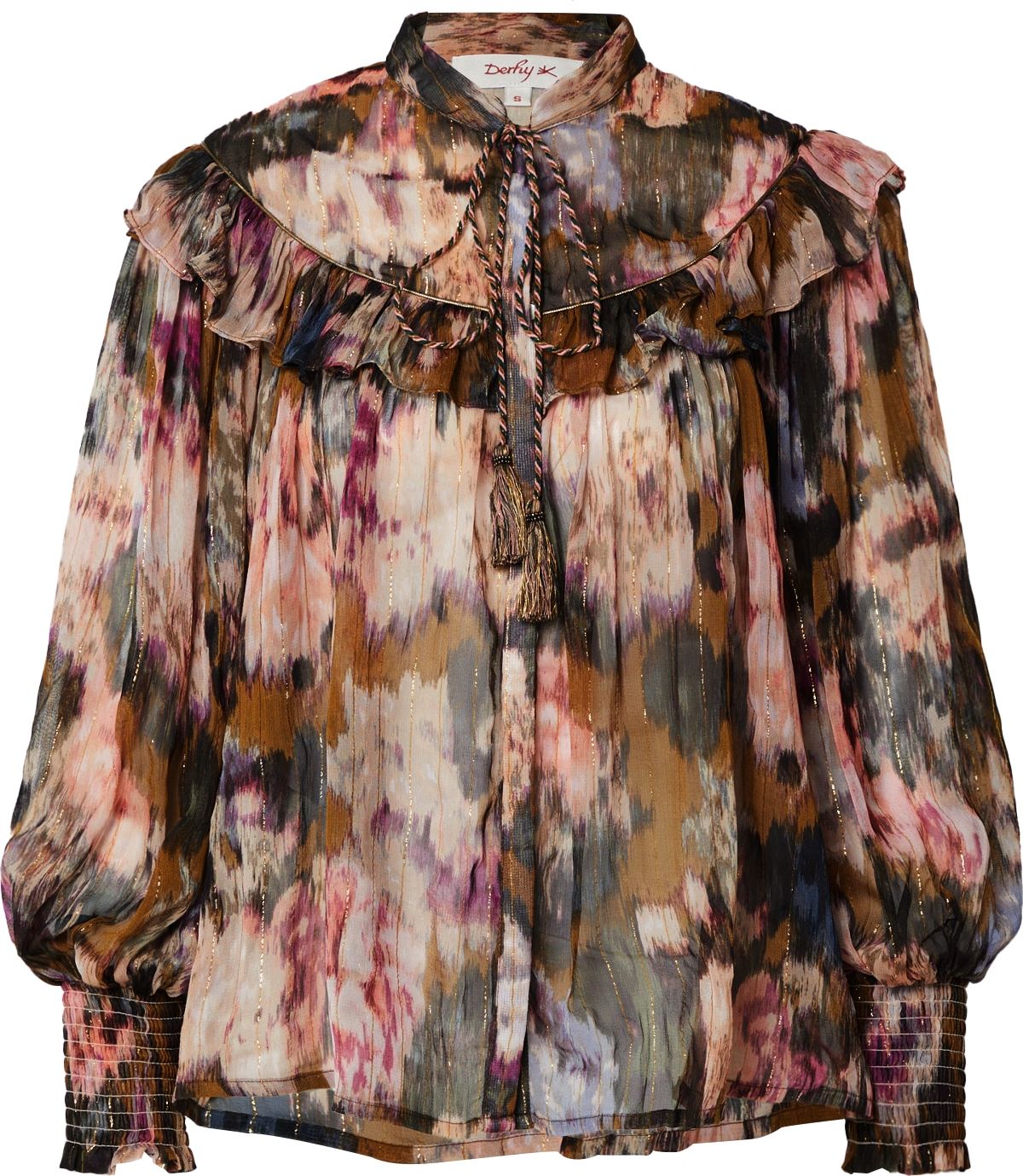 Styl halenky: Klasická halenka; Design: Prošitý spodní lem, Skrytá knoflíková léga, Na uzel/zavázání; Typ uzávěru: Knoflíkové zapínání; Materiál: Viskóza; Košilový límec: Stojáček; Detaily: Volán, Nařásněné; Extra: Třásně/střapce, Třpytivé, Celoplošný vzor, Splývavá látka, Chladivý povrch; Střih: Normální střih; Délka rukávu: Dlouhý rukáv; Délka: Normální délka