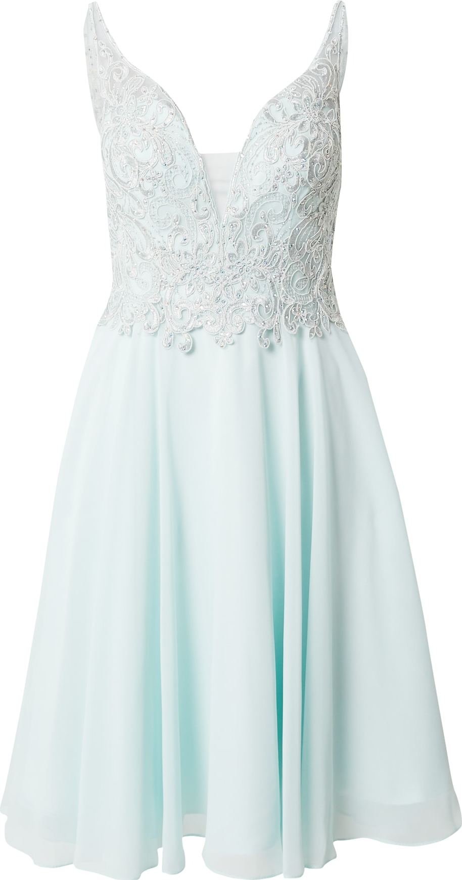 Design: Prošitý spodní lem, Zadní zip, Hluboký výstřih/dekolt, Zadní výstřih; Typ uzávěru: Zip; Materiál: Šifón; Výstřih: Výstřih do V; Vzor: Jednobarevný; Druh ramínka: Normální ramínka; Detaily: Krajka, Ozdobné kameny, Nařásněné, S hlubokým výstřihem na zádech; Extra: Aplikace, Švy tón v tónu, Lehká látka; Délka: Ke kolenům; Střih: Postavu zvýrazňující střih; Délka rukávu: Bez rukávů