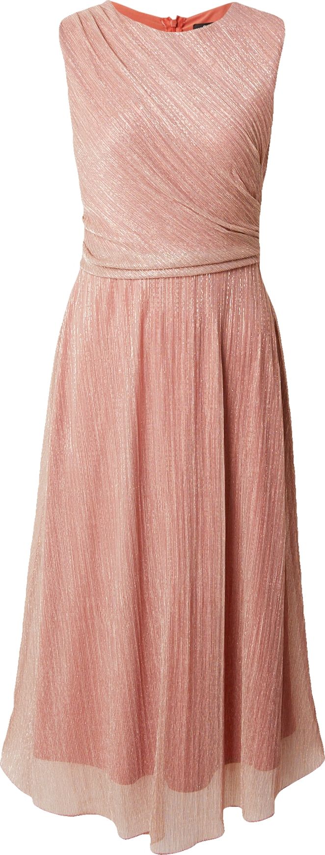 Design: Prošitý spodní lem, Zadní zip, Vypasovaný střih; Typ uzávěru: Zip; Výstřih: Kulatý výstřih; Vzor: Jednobarevný; Druh ramínka: Široká ramínka; Detaily: Nařásněné; Extra: Lesklé, Lehká látka; Délka: Ke kolenům; Střih: Normální střih; Délka rukávu: Bez rukávů
