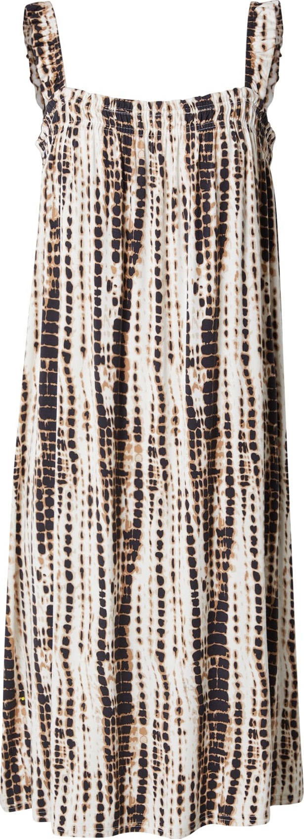 Design: Prošitý spodní lem, Rovný lem, Rovný střih; Materiál: Viskóza; Výstřih: Hranatý výstřih; Druh ramínka: Normální ramínka; Detaily: Nařásněné; Extra: Celoplošný vzor, Měkký povrch; Délka: Ke kolenům; Střih: Volný střih; Délka rukávu: Bez rukávů