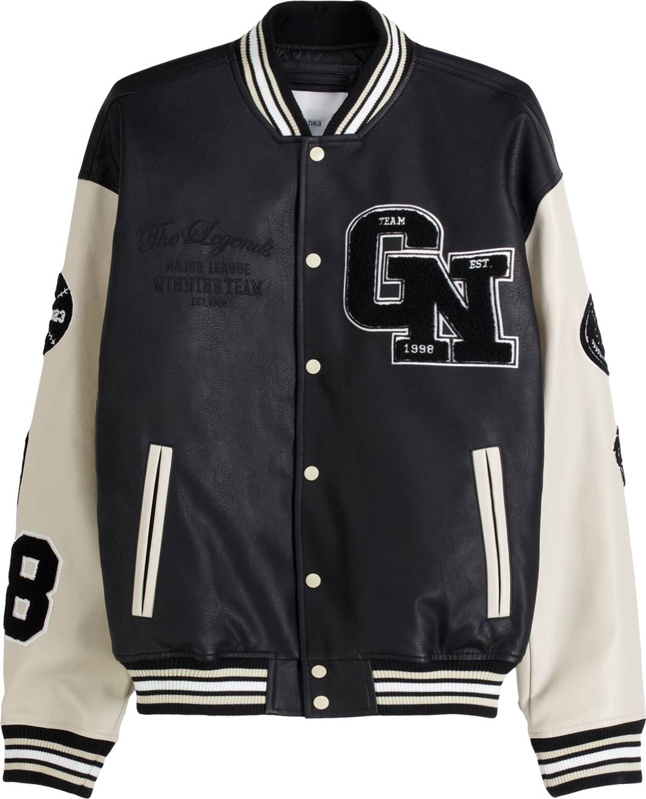 Design: Pružný límec, Patentky, Rovný lem, Žebrovaný okraj, Boční průhmatové kapsy; Typ uzávěru: Tlačítko; Druh bundy: Univerzitní bunda; Podšívka: Lehce podšitá; Materiál: Imitace kůže; Vzor: S nápisem; Extra: Švy tón v tónu, Hladká látka; Střih: Volný střih