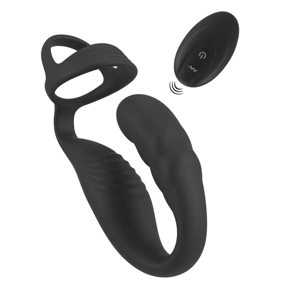Stimulace více míst: vibrující kolík pro prostatu, střed pro perineum a erekční kroužek pro penis a varlata.
