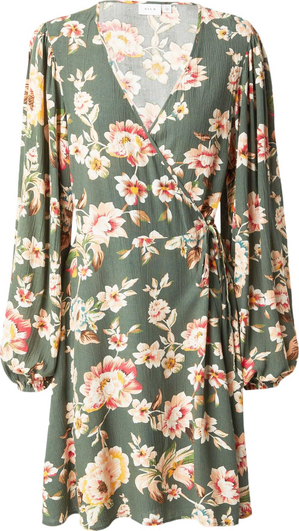 Design: Prošitý spodní lem, Rozšiřující se střih, Elastický pas/okraj, Rovný lem, Nabírané rukávy; Materiál: Viskóza; Výstřih: Výstřih do V; Vzor: Květovaný; Detaily: Nařásněné, Zavinování; Extra: Celoplošný vzor, Měkký povrch; Délka: Krátká/mini; Střih: Normální střih; Délka rukávu: Dlouhý rukáv