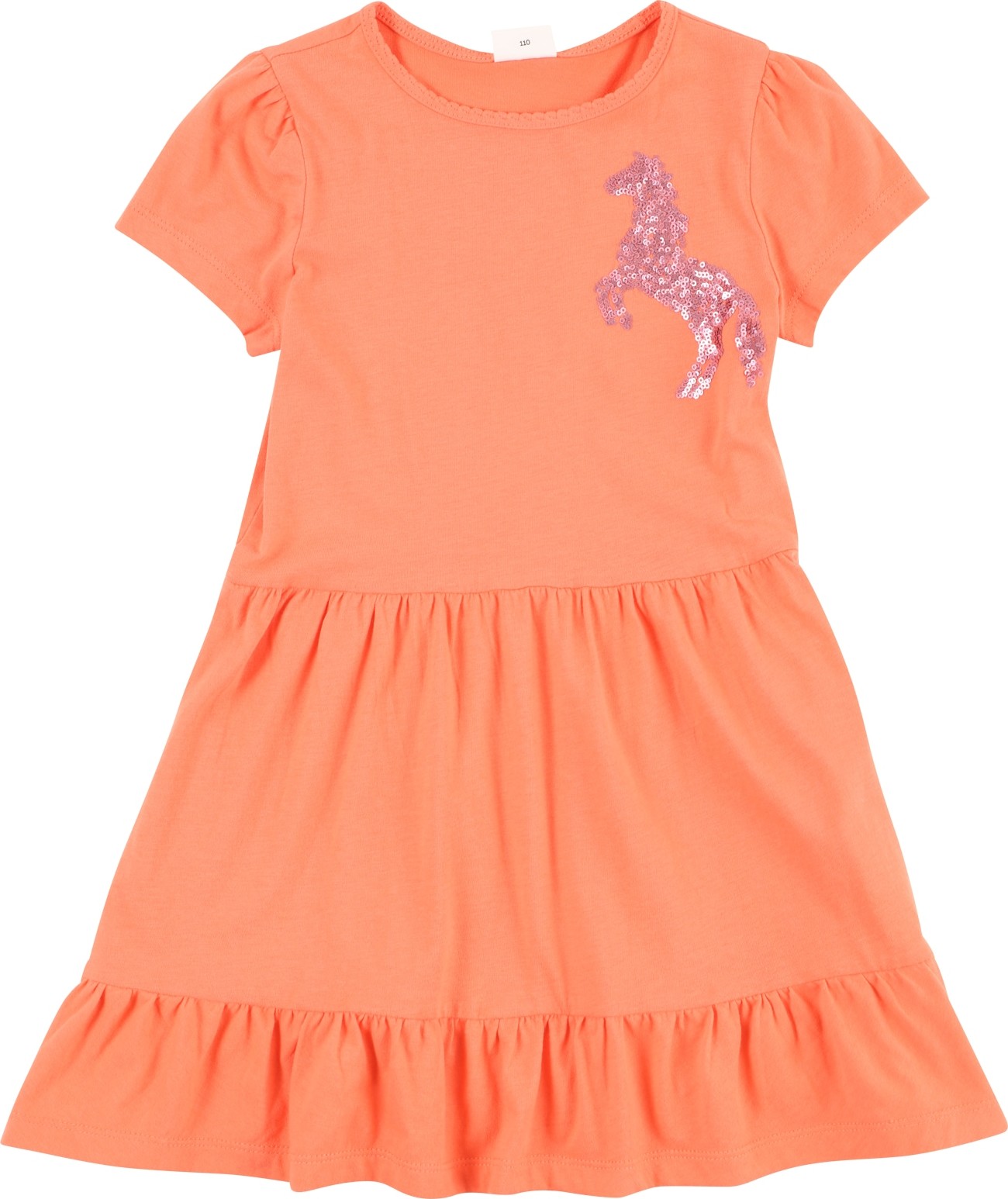 Design: Prošitý spodní lem, Rozšiřující se střih, Lemovaný výstřih; Materiál: žerzej; Výstřih: Kulatý výstřih; Vzor: Potisk - motiv; Detaily: Flitry, Volán, Nařásněné; Extra: Aplikace, Švy tón v tónu, Měkký povrch; Délka: Krátká/mini; Střih: Normální střih; Délka rukávu: Čtvrtinový rukáv
