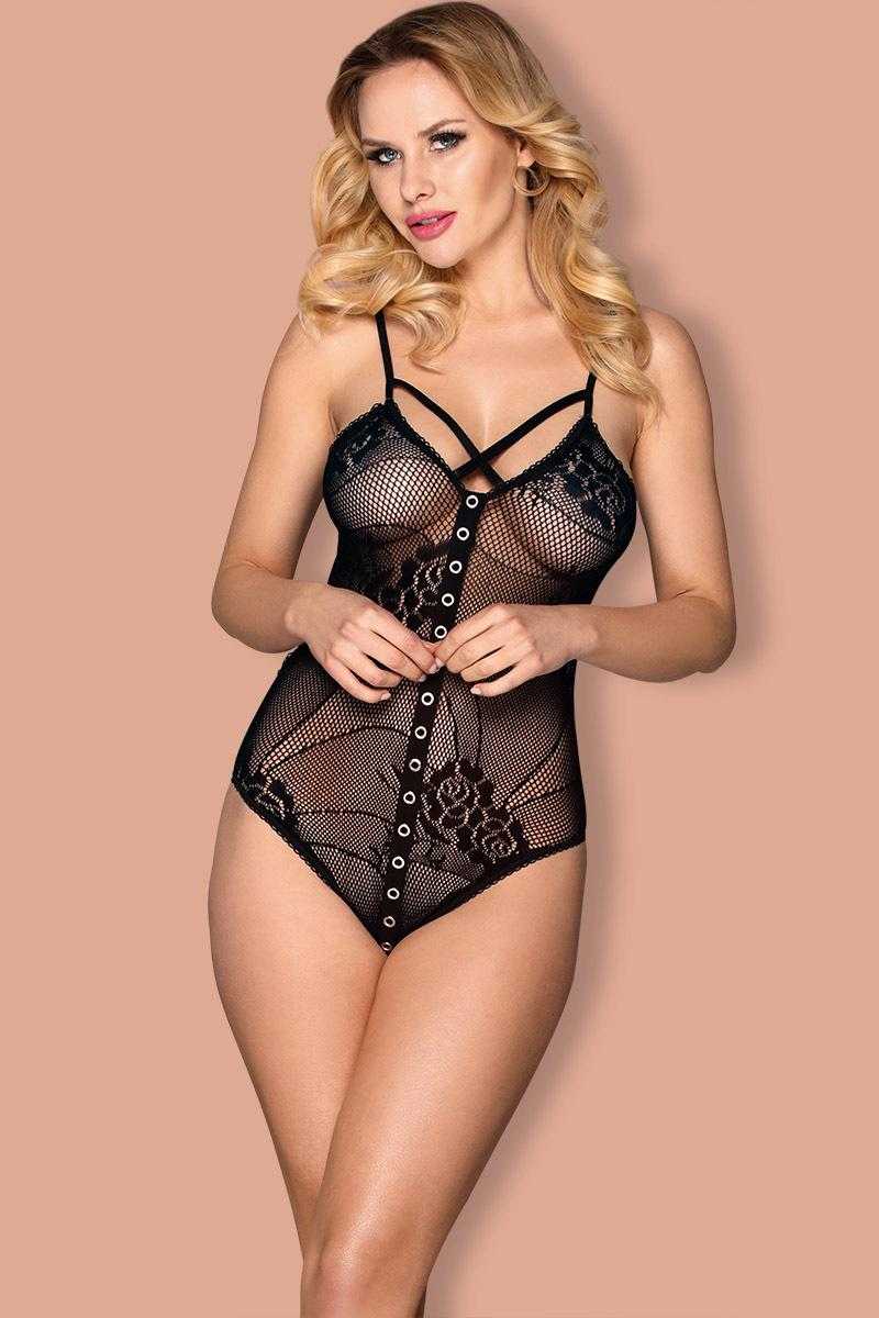 Fantastické body ze síťoviny s květinovým vzorem. Ramínka jsou nastavitelná, stejně jako pásky v rozkroku. Na zadečku je šněrování. Růžová mašlička smyslně kontrastuje s černou barvou body. Přední díl je ozdoben kovovými cvočky, které napodobují knoflíky.